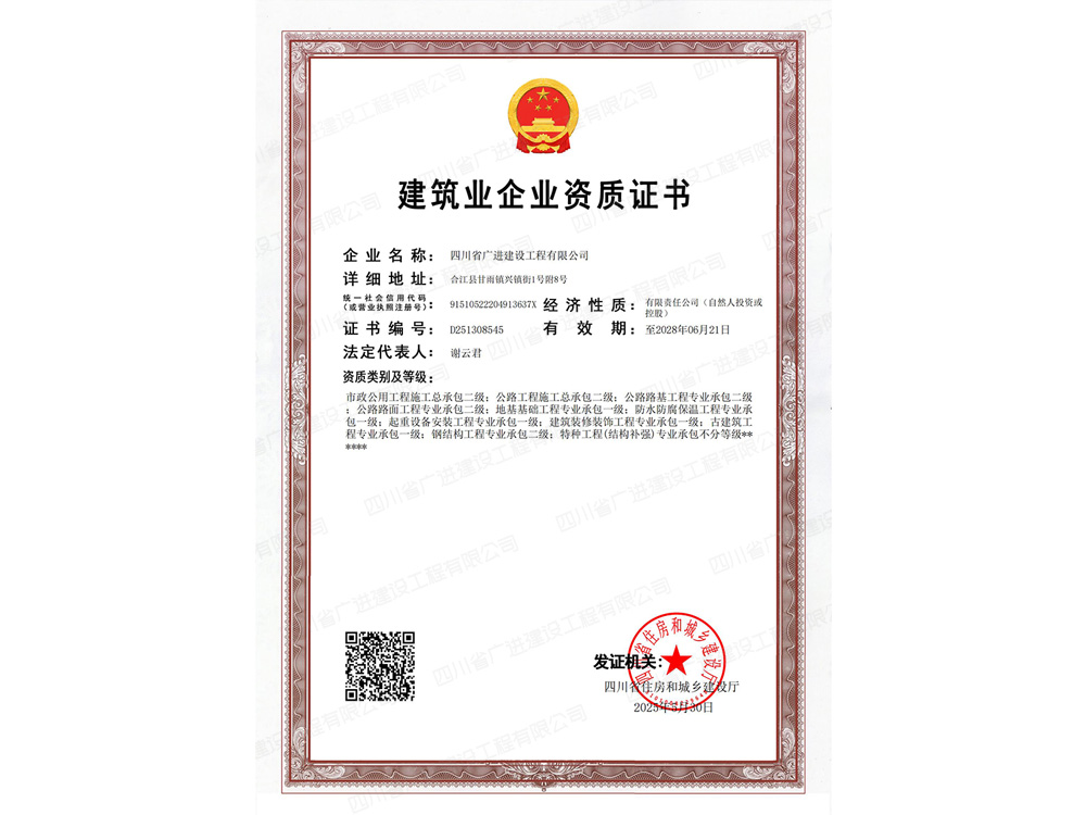 目前,公司建筑工程施工總承包資質(zhì)已升級為壹級資質(zhì),公司有職工280余人,有職稱人員113人(其中高級職稱3人、中級職稱32人、初級職稱78人);各類管理上崗人員40余人;大中專學(xué)歷85余人;高中專學(xué)歷120余人。企業(yè)法人代表兼總經(jīng)理:謝云君,注冊資金壹億伍仟萬元,下面設(shè)有一個分公司“四川省廣進建設(shè)工程有限公司赤水分公司”,分公司地址:貴州省遵義市赤水市太平街。